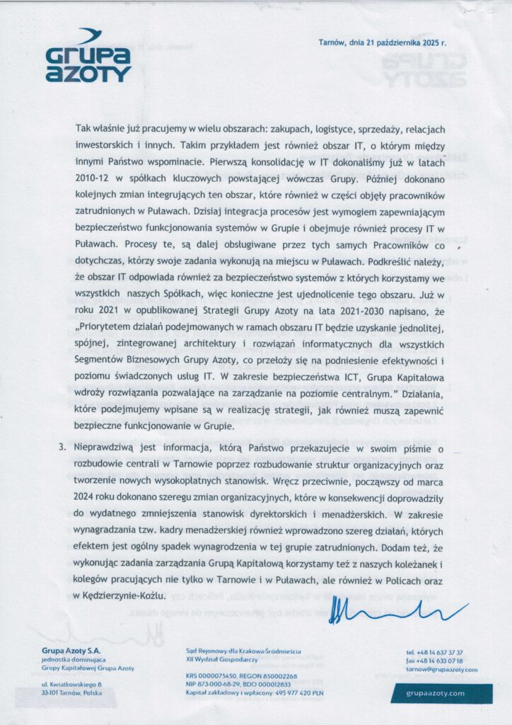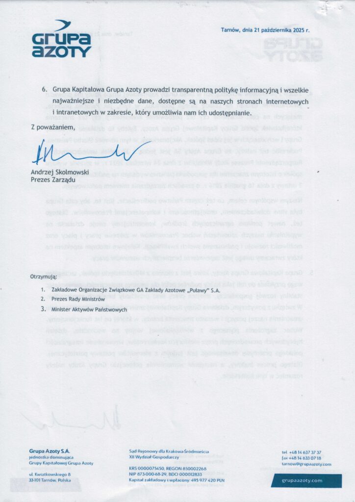 Odpowiedź Zarządu Grupy Azoty na pismo z dnia 07.10.2025r