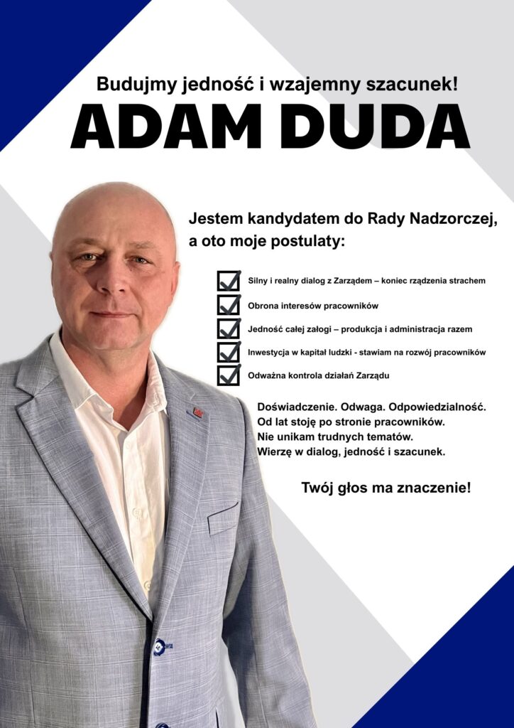 My, jako Związek Zawodowy MZZPZAP, popieramy kandydaturę Adama Dudy na członka Rady Nadzorczej z ramienia załogi. Uważamy, że jego doświadczenie zawodowe, zaangażowanie społeczne oraz wieloletnia działalność związkowa gwarantują odpowiedzialną i skuteczną reprezentację pracowników.