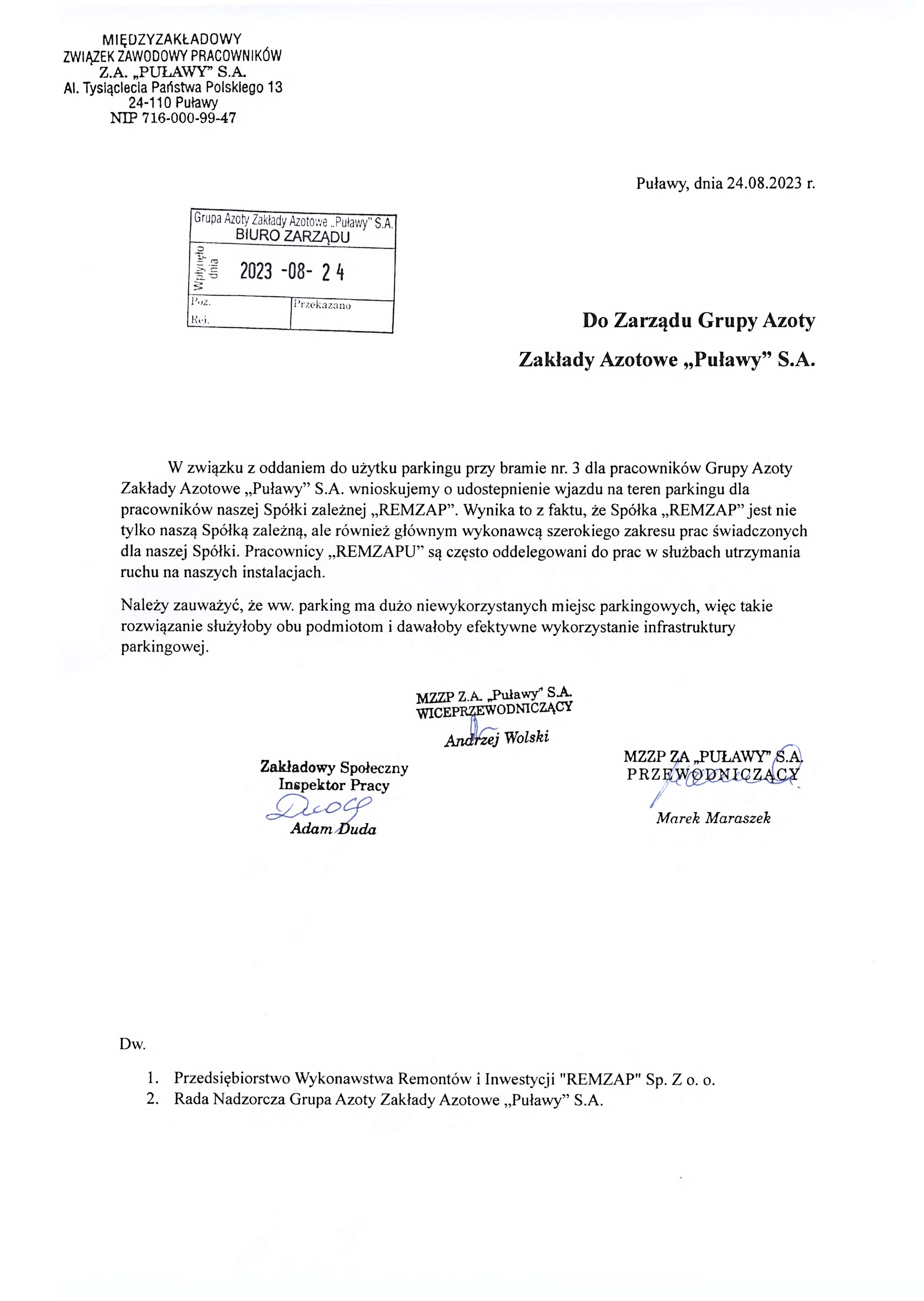 Pismo w związku z oddaniem do użytku parkingu przy bramie nr 3